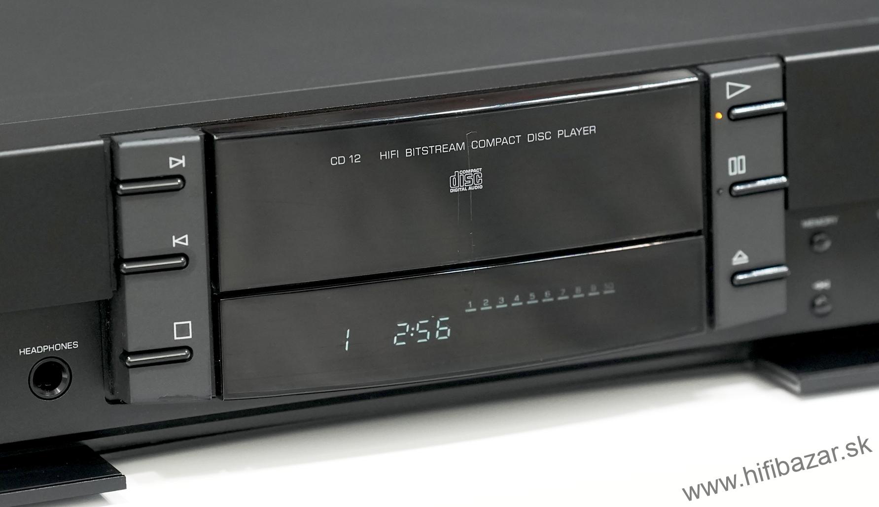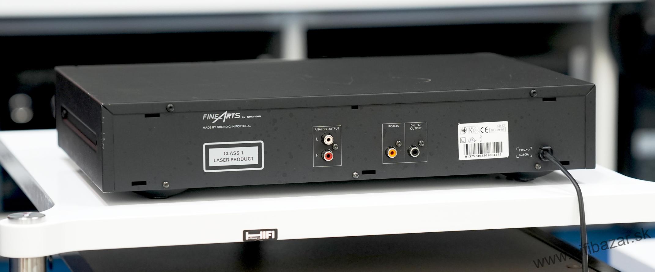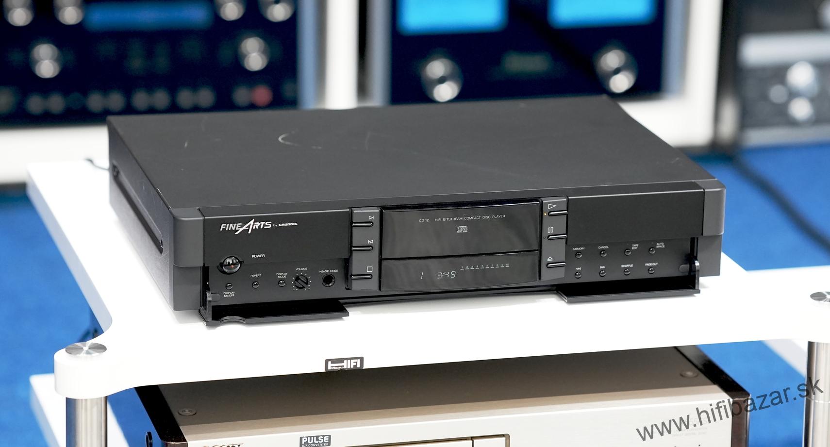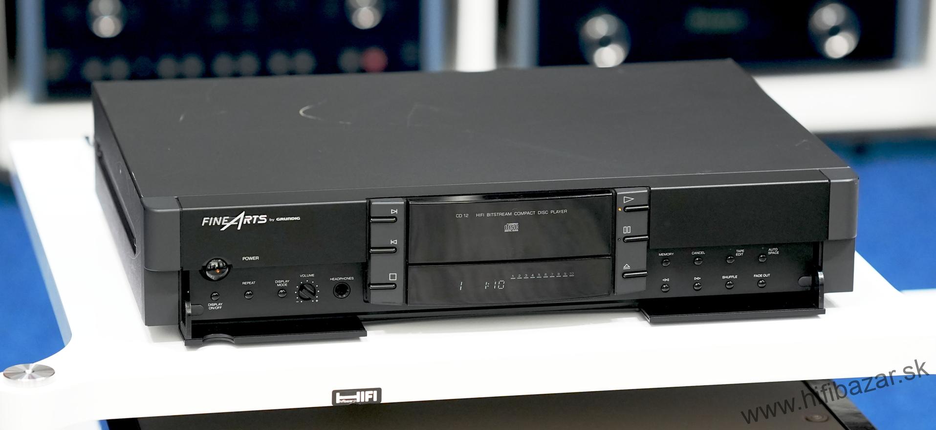 Grundig CD-12 je CD prehrávač z rady Fine Arts, postavený ako kompaktný, robustný komponent s kovovým telom. Ide o zaoblený „bookshelf“ dizajn v rozmere bežnom pre hi-fi komponenty. Prehráva štandardné CD disky a poskytuje analógový (RCA) výstup a digitálny koaxiálny výstup. Typ: CD prehrávač, DA prevodník: TDA1541, CD mechanizmus: Philips VAM1202, frekvenčný rozsah: 20 Hz - 20 kHz, dynamický rozsah: 96 dB, pomer signálu k šumu: 102 dB, oddelenie kanálov: 96 dB, THD (celkové harmonické skreslenie): < 0,006 %, výstupná úroveň: 2,0 Vrms, digitálny výstup: Áno (S/PDIF), slúchadlový výstup: Áno (s ovládaním hlasitosti), spotreba: 12 W, rozmery: 435 x 75 x 295 mm, hmotnosť: 3,5 kg.