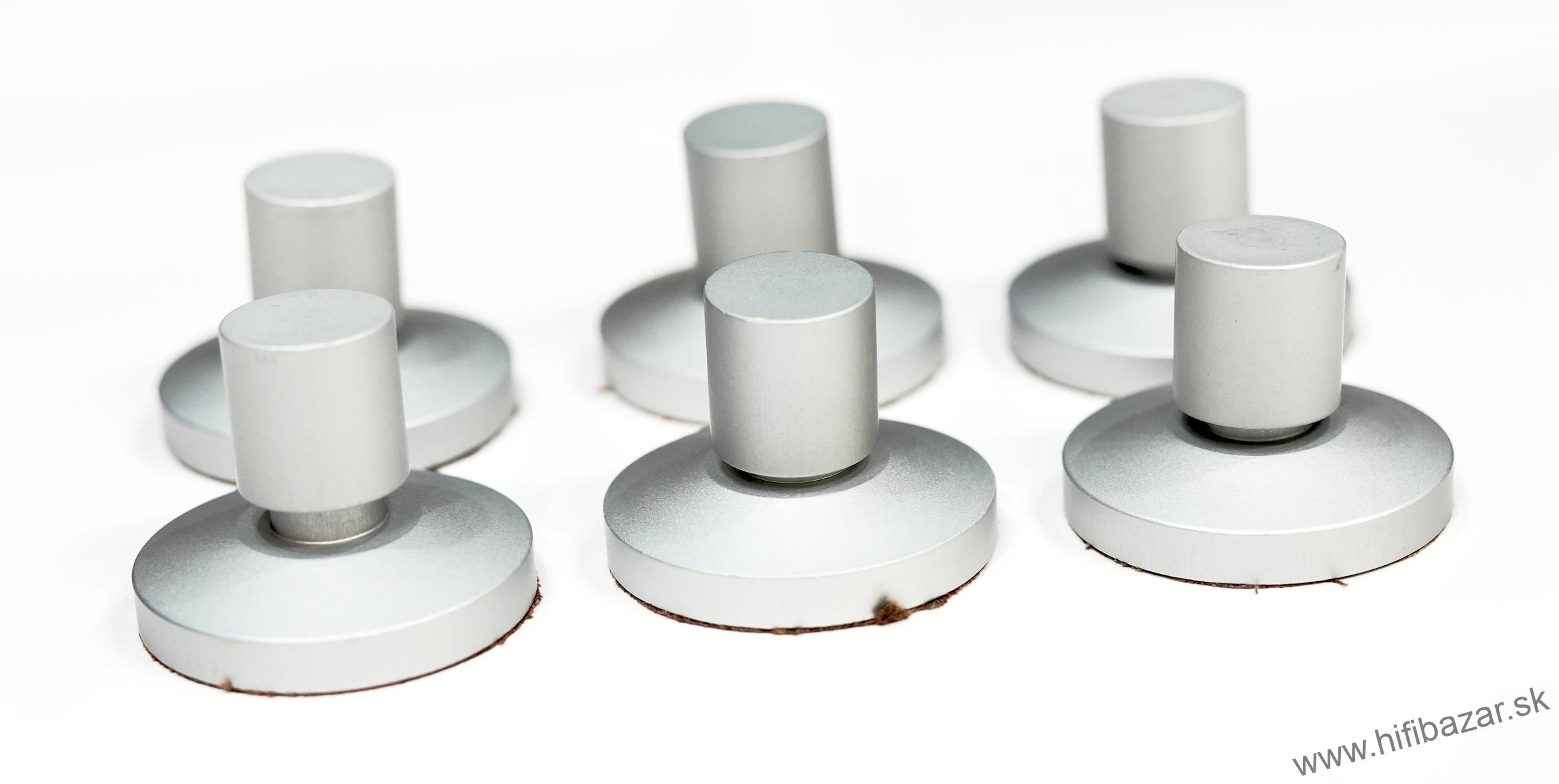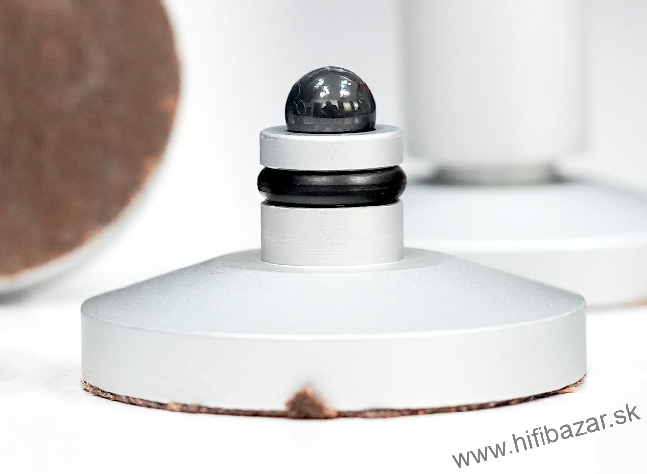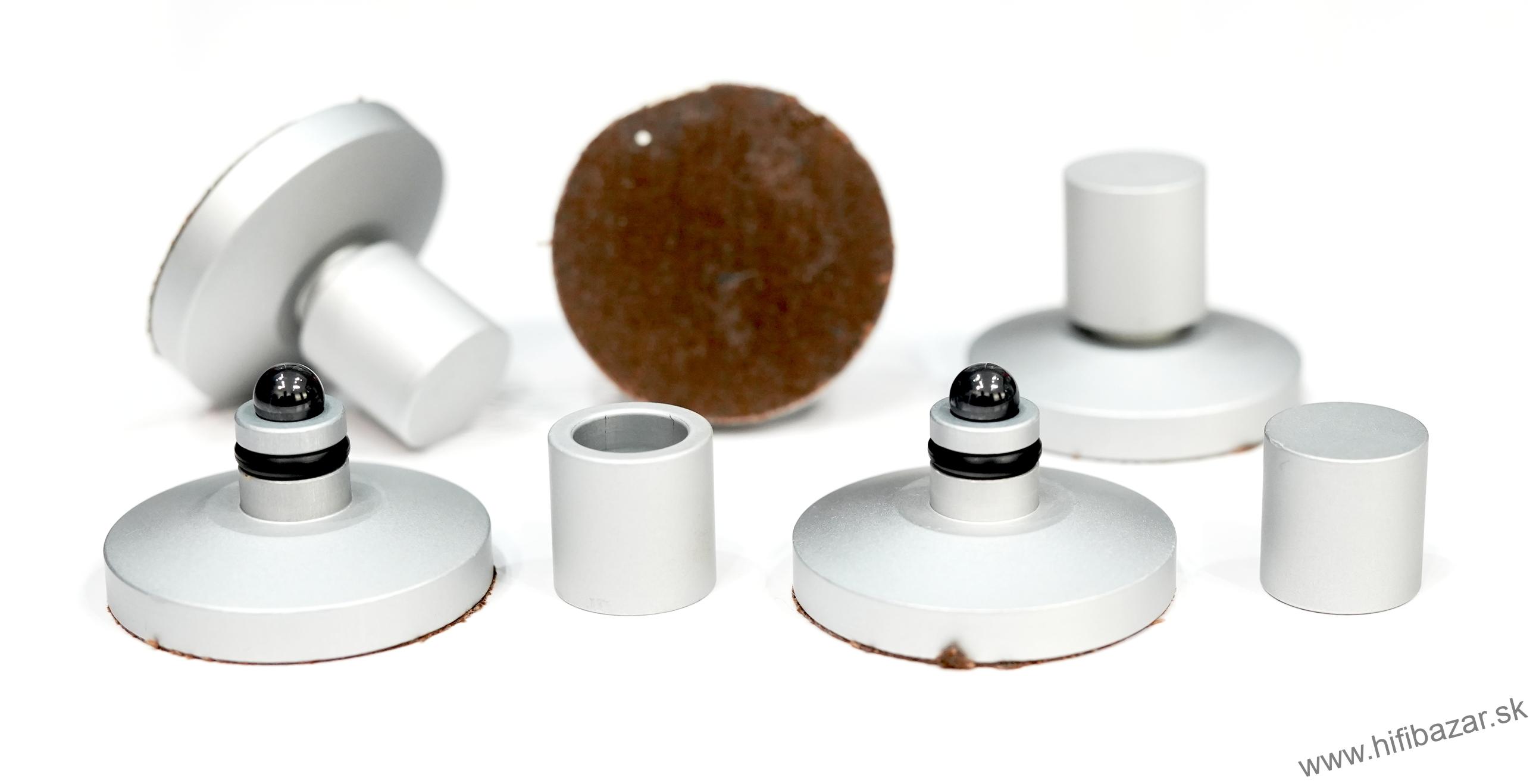Materiál: precízne opracovaná nehrdzavejúca oceľ (stainless steel) a high-tech keramická guľa, tesnenie: elastomérový O-krúžok na centrovanie a jemné tlmenie. Rozmery: výška: 25 mm, priemer hornej časti: Ø 15 mm, priemer spodnej časti: Ø 35 mm, nosnosť: 300 kg (sada 4 kusov), optimálny rozsah hmotnosti komponentu: 5 - 40 kg na jednu nožičku. Uvedená cena je za sadu 6 kusov.