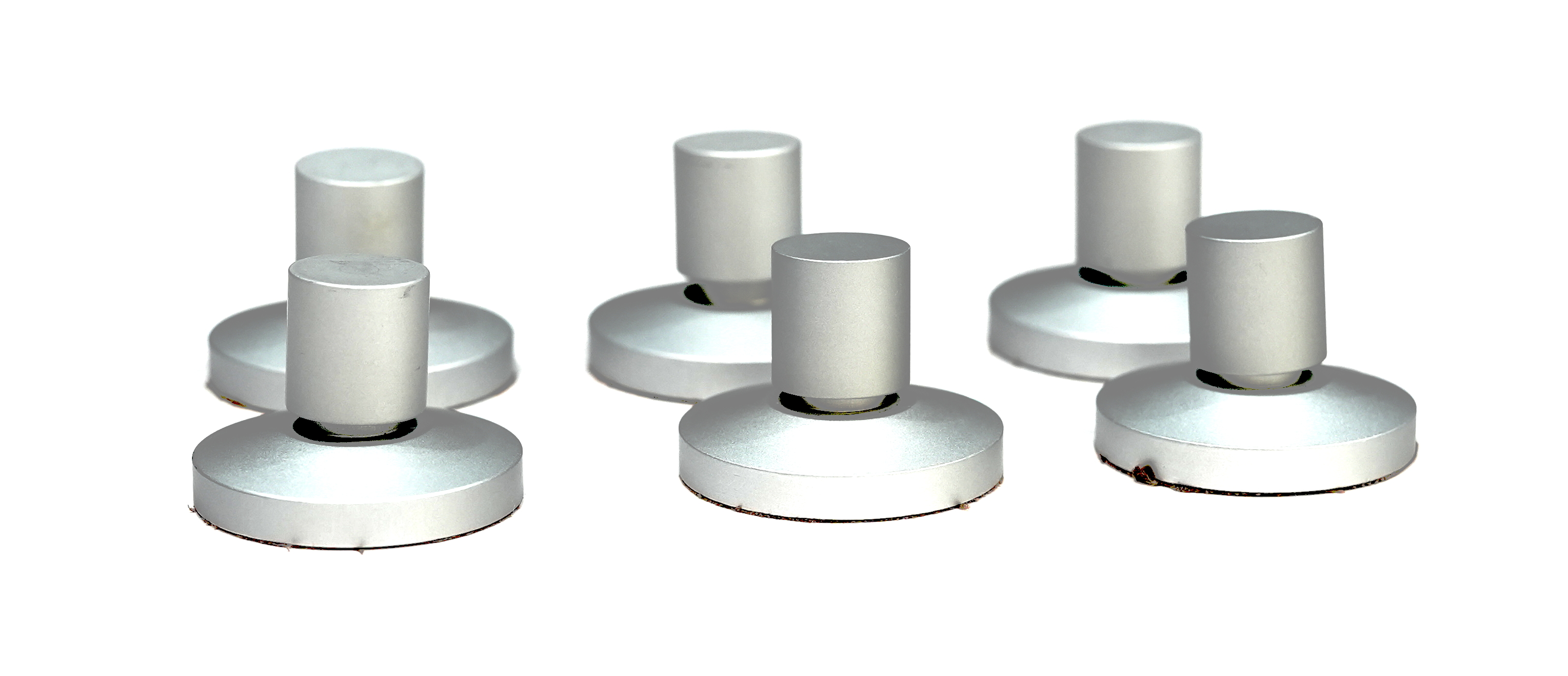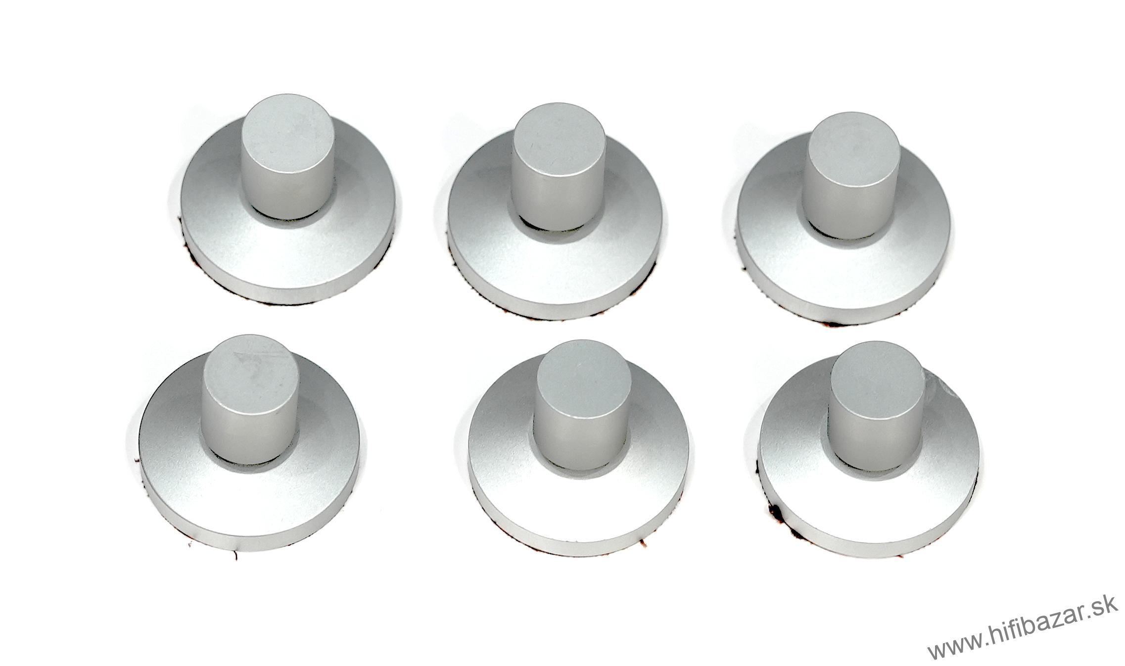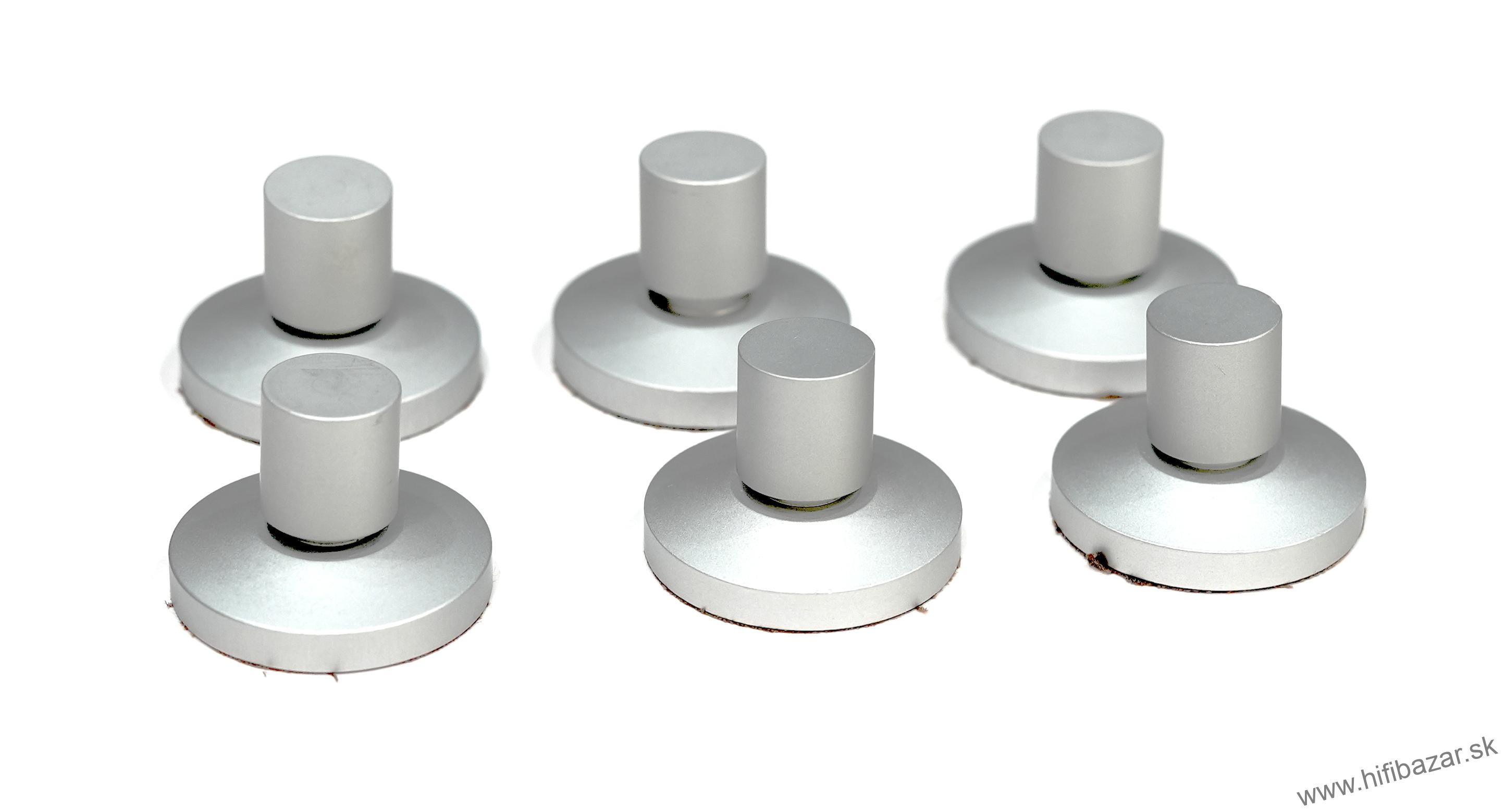 Materiál: precízne opracovaná nehrdzavejúca oceľ (stainless steel) a high-tech keramická guľa, tesnenie: elastomérový O-krúžok na centrovanie a jemné tlmenie. Rozmery: výška: 25 mm, priemer hornej časti: Ø 15 mm, priemer spodnej časti: Ø 35 mm, nosnosť: 300 kg (sada 4 kusov), optimálny rozsah hmotnosti komponentu: 5 - 40 kg na jednu nožičku. Uvedená cena je za sadu 6 kusov.