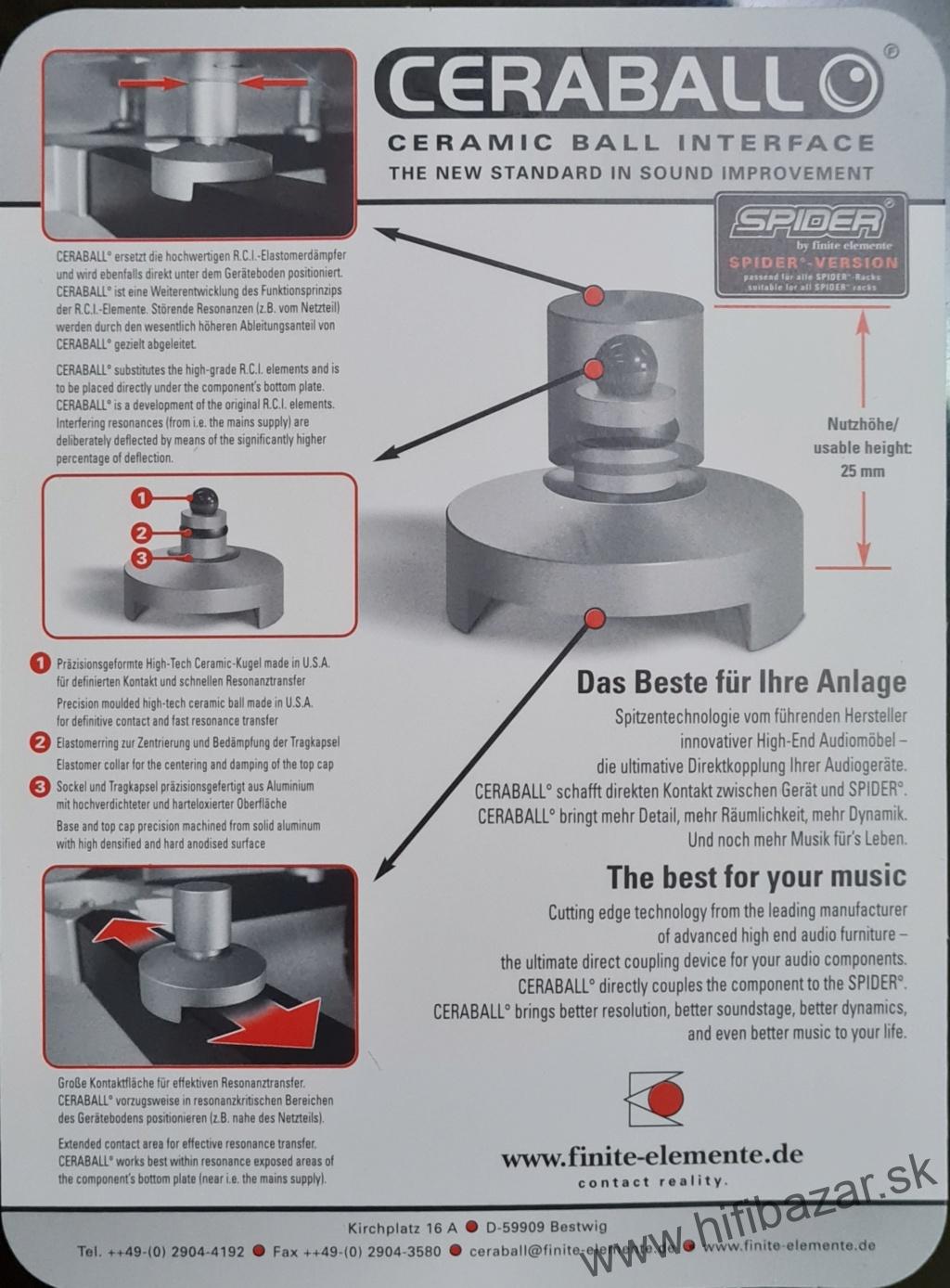 Finite Elemente Ceraball sú kompaktné antivibračné nožičky určené pod audio komponenty, používajú presnú keramickú guľôčku ako kontakt medzi hornou a dolnou časťou aby rýchlo a kontrolovane odvádzali neželané rezonancie, čím zlepšujú rozlíšenie, dynamiku a priestorovú presnosť zvuku. Ceraball je jednoduché, ale veľmi účinné riešenie - malá, vysokovýkonná „top-hat“ nožička z precízne opracovanej nerezovej ocele so špičkovou keramickou guľôčkou vo vnútri. Položíš ju pod komponent a okamžite cítiš pevnejší bas, čistejšie kontúry nástrojov a väčší pokoj v pozadí nahrávky. Je to jeden z najprístupnejších krokov k tomu, aby tvoja zostava znela pokojnejšie a presnejšie bez zásahov do elektroniky.