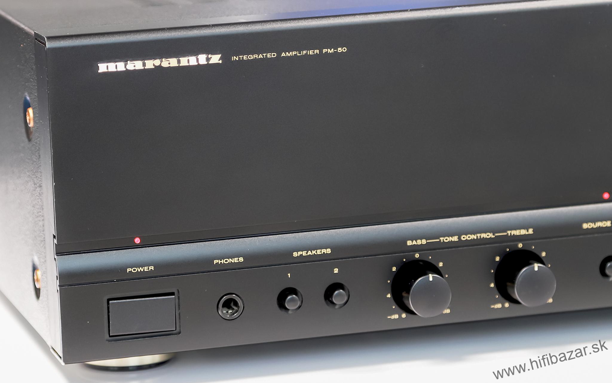 Marantz PM-50 je stereofónny integrovaný zosilňovač z 90. rokov, z obdobia, keď Marantz ešte vyrábal kvalitné zariadenia aj v nižšej triede. Ide o zaujímavý model z hľadiska zvuku aj konštrukcie, hoci dnes už patrí medzi vintage komponenty. Zvuk je jemne teplejší, mierne zaoblený, ale detailný. Vhodný skôr pre klasickú hudbu, jazz, pop, vokály a ľahší rock. Nepôsobí agresívne, má slušné priestorové podanie a dobrú kontrolu basov. Prepínač „Source Direct“ obchádza tónové korekcie a zlepšuje transparentnosť zvuku. Použité MOSFET tranzistory vo výstupnej časti (dodávajú jemnosť a muzikalitu). Solídna mechanická konštrukcia na svoju triedu - kovové šasi, dobré tienenie. Dobre dimenzovaný napájací zdroj s klasickým EI transformátorom, oddelené sekcie pre predzosilňovač a koncový stupeň, použité diskrétne súčiastky v koncovom stupni.